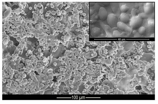 These results indicate that the microcapsules were incorporated into the cotton and polyamide structures, since after 40 wash cycles, there were still microcapsules embedded into the substrates, as can be seen from the microscopy shown in Figure 9 and Figure 10. These results are superior to those found by Ramya et al. [65] who, when evaluating the durability to washing for herb extract microcapsules, found that the microcapsules presented good resistance up to 30 wash cycles due to the sustained release of the encapsulated extracts.