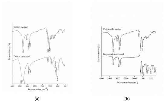 Infrared spectrum with attenuated reflectance (FTIR/ATR) of pure and treated (a) cotton and (b) polyamide substrates.