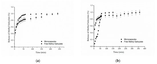 Figure 5a,b presents the in vitro release profiles for cotton and polyamide samples, respectively. For both samples, it can be observed that the methyl salicylate, when freely impregnated into the textile structure, was completely released in approximately 60 min, reaching 98% of the released compound. Regarding the samples functionalized with microcapsules, the results showed release profiles in two stages: a rapid initial release (burst effect), followed by a slower increase until the equilibrium, in which the maximum amount of methyl salicylate released is reached after 250 min for cotton and 350 min for polyamide. Similar behaviors were found in the works of Ma et al. [58], Aguiar et al. [59] and Macha et al. [60]. The first release step may be explained by the release of the methyl salicylate that was on the surface of the textile substrate due to the method of application, that is, the part of the active compound that was not coated by the microcapsules [60].