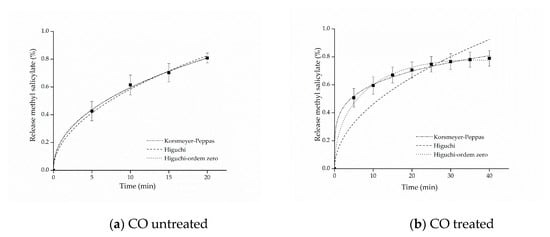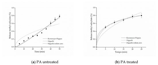The study of the release profile of an active compound from polymeric systems is important to understand its behavior and the mechanism by which release occurs. To better understand and evaluate the release of methyl salicylate, mathematical models were adopted to adjust the release system, and the selected models were Higuchi [56] and Korsmeyer–Peppas et al. [57].
