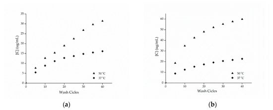 The cotton and polyamide substrates treated with microcapsules and cross-linked with citric acid were subjected to washing tests at temperatures of 37 and 50 °C with the procedure adapted from the Standard AATCC 61-2007-2A. Figure 8 shows the release profiles of the microcapsules against the number of wash cycles. Based on these data, it can be seen that the samples presented a high resistance to washing, showing an increase in the durability of the finishing.
