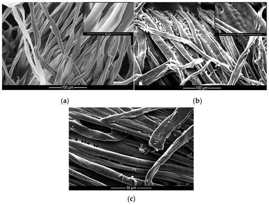 Microscopy of (a) untreated, (b) treated and (c) washed cotton samples.