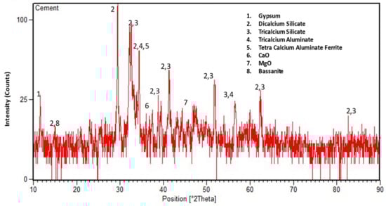 Locally available Type-I ordinary Portland cement (OPC) conforming to ASTM C-150 was used during the testing []. The X-ray diffraction (XRD) analyzer was used to find the mineral composition of OPC. Copper (Cu) was selected as an X-ray target, and the diffractograms were recorded at a wavelength of 1.54 Å with typical peaks attained at different 2-theta, as shown in Figure 1. Dominant mineral phases of OPC such as tricalcium silicate, dicalcium silicate, tricalcium aluminate, and tetra calcium aluminate ferrite were detected in XRD. Other chemical compounds of OPC such as gypsum, CaO, and MgO were also observed in the XRD profile. The particle size distribution (PSD) of cement was determined using a laser particle size analyzer. The PSD curve (Figure 2) shows that cement grains are coarser than WBBP particles and finer than hydrated lime particles. The chemical oxide composition was determined through the X-ray fluorescence spectrometer, as shown in Table 2. The physical properties of OPC are displayed in Table 3.
