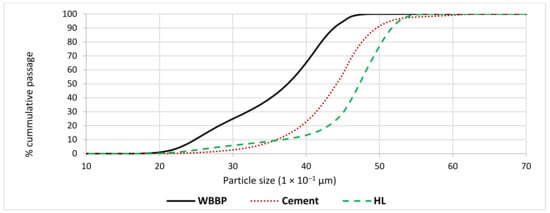 The particle size distribution of cement, waste burnt brick powder (WBBP), and hydrated lime (HL).