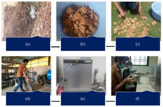 Preparation process of waste burnt brick powder (WBBP): (a) collection site of waste bricks; (b) collected bricks are crushed into smaller size and washed to remove dirt; (c) the wet pieces of waste bricks are dried under sunlight for 1 day; (d) The sun-dried sample is converted into powder using the ball milling process; (e) to remove any moisture content, the WBBP is oven-dried for 24 h; (f) the oven-dried powder is converted into ultrafine particles through manual pulverization, and then it is sieved through a 75 µm sieve and stored in airtight buckets.