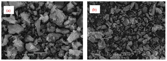 Scanning electron microscopy images of waste burnt brick powder: (a) at 5 µm resolution; (b) at 10 µm resolution.
