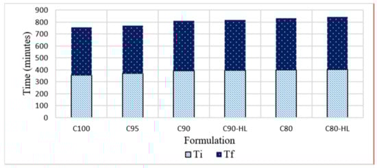 The setting time of paste depends on the particle size and tri-calcium silicate (C3S) content of the cement [,]. The cement paste sets quickly if it contains a high content of the C3S phase. C3S is mainly responsible for the initial setting time (Ti). Figure 9 shows that the control formulation achieved Ti faster than formulations containing WBBP because of the higher amount of C3S in the control mix. However, the final setting time (Tf) of the formulations does not show much variation because the activation energy remains constant at the final setting time for natural pozzolan replacements up to 20% [].