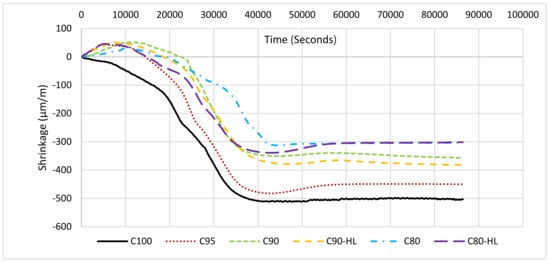 Shrinkage is the reduction in the volume of cement paste after the start of the hydration process. The reduction in the volume of the cement paste can be a result of several parallel operating shrinkage mechanisms including autogenous shrinkage, drying shrinkage due to loss of water to the surroundings, and shrinkage due to carbonation []. In the current study, the “Modified German Schwindrine” apparatus measuring 4 cm × 6 cm × 25 cm, interfaced with a computer, and having a sensitivity of 0.31 microns/m was used to measure the linear early shrinkage response of SCP formulations at 20 ± 1 °C for 24 h. The samples were not sealed during the experiment. Further, the isothermal condition for shrinkage measurement with the apparatus was not possible. Therefore, it measured the total shrinkage of the cement paste. The data recording of shrinkage started after 5 min of paste mixing and recorded for 24 h.
