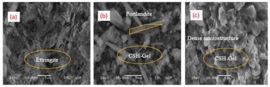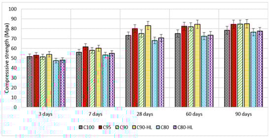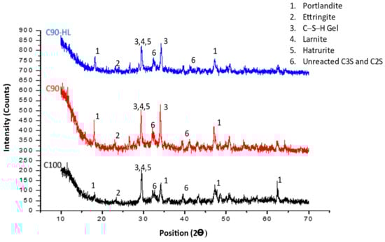 The enhancement in the strength of specimens containing WBBP up to 10% and HL can be attributed to the pozzolanic reaction [], better pore refinement [], and filler effects []. However, the reduced early-age strength of C80 was due to the high replacement percentage of cement with WBBP [,]. The high percentage of cement replacement with pozzolans slows down the pozzolanic action due to the unavailability of sufficient calcium hydroxide at the early age of hydration of cement []. The addition of HL improved the early strength, but it does not have a telling effect on the long-term strength, which might be due to the presence of sufficient portlandite from the hydration of cement at later stages.