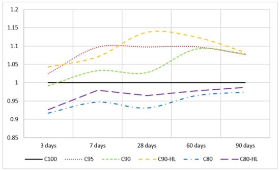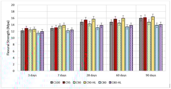 Flexural and compressive strengths at the ages of 3, 7, 28, 60, and 90 days are shown in Figure 11 and Figure 12, respectively. The results indicate that the compressive and flexural strengths of C95, C90, and C90-HL were higher as compared to C100 at 3, 7, 28, 60, and 90 days. However, the strength-gaining capability of C80 was comparatively low until 28 days. However, after 28 days, the strength index became higher than 0.95, as shown in Figure 13, and at the age of 90 days, the strength became almost equal to C100. It is worth noting that WBBP formulations having HL (C90-HL and C80-HL) showed improved mechanical properties compared to formulations without HL (C90 and C80). Further, it can be seen in Figure 11 and Figure 12 that C90-HL showed superior mechanical properties compared to the other formulations.