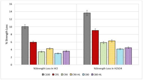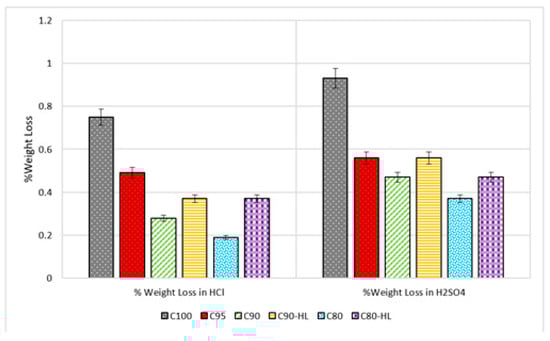 Concrete containing SCM is more durable against the acid attack. The durability of concrete against acid attack is usually measured in terms of the percentage reduction in weight and strength loss when exposed to the acidic environment. The reduction in the weight of paste when exposed to the acidic environment is due to the loss of cohesiveness of the cement hydration products []. The hydration product such as calcium hydroxide (CH) reacts with the acid to precipitate gypsum []. Precipitation of gypsum causes expansion and cracking in the cement matrix. Once CH is depleted, the pH of the pore solution decreases, and as a result, the decalcification of the calcium silica hydrate (C–S–H) phase initiates causing the increase in porosity and degradation of the cement paste [,,,].