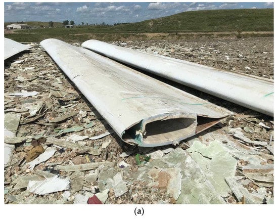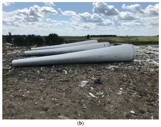 The waste management hierarchy can be ranked from less favored to preferential option as follows: landfill energy recovery from wastes → recycling → reuse, → reducing the amount of waste [17,18,19]. In [20,21], the waste hierarchy for sustainable blade waste management is ranked (from less favored to preferential option) as: disposal → recovery → recycling → repurpose → reuse → prevention. Windmill blades can be landfilled in the USA [22], and are often incinerated in Europe [23]. Figure 1 shows old wind turbine, landfilled in the Sioux Falls, USA.
