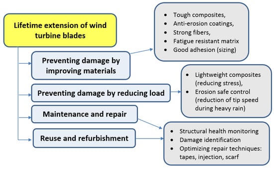 One of the approaches is to delay the problem, by extending the durability of the blades. As noted in [25], durability is one of the “most obvious strategies for reducing waste and increasing material productivity”. There exist several options to increase the service time of wind turbine blades, among them, using more durable materials, ensure better maintenance, repair, reuse and refurbishment [26]. Figure 2 shows a schema of various approaches of the extension of lifetime of wind turbine blades. The different ways of lifetime extension of blades are discussed in more details in the following sections.