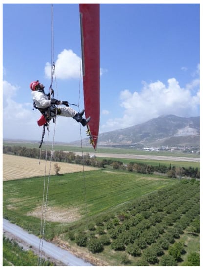 On-site repair of wind turbine blade. Reprinted with kind permission from Mira Rope Access, http://www.mira-ra.com, (accessed on 13 January 2021).
