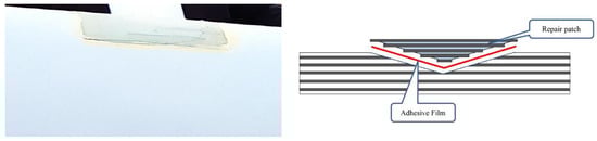 Structural repair is carried out by attaching the repair patch/scarf to the parent laminate [32]. The repair can be carried on site (which can take ~21 h of technicians work and cost of the order of 4800 EUR [31]), or transported to the factory (which costs much more). Figure 3 shows a photo of on-site repair of wind turbine. The patches can be applied as composite patch co-cured with the adhesive (soft patch), pre-manufactured patch in mold (hard patch molded), machined hard patch, and semi-hard patch (series of pre-cured composite laminates, each with several plies, interleaved with adhesives and bonded) [60], as pre-cured thin patches, with glue between them [61]. Figure 4 shows photo of a wind turbine blade with patch, and a computational model of a coating/patch/adhesive/parent structure system, developed in [62].