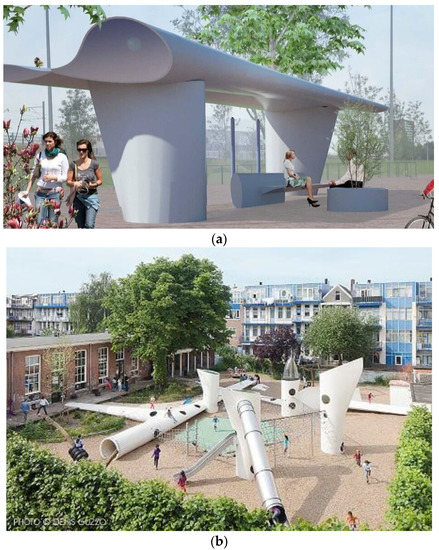 Re-use of wind turbine blades, in station (a) and in playground (b). The photo of the design by Superuse Studios is reproduced here with kind permission of New Citizen Design and Dennis Gusto Photography.