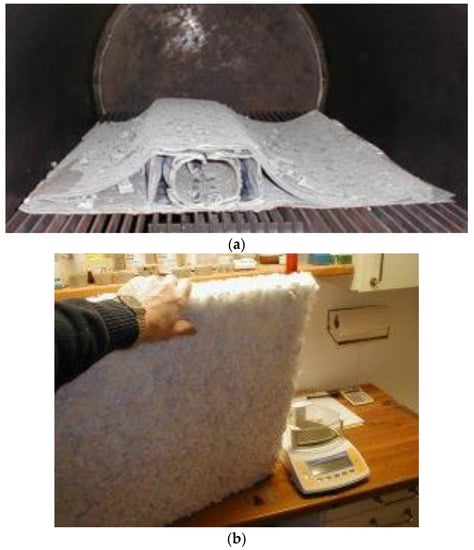 Wind Turbine Blade part after pyrolysis and Insulation (a) and Wool Mat made from blade fibers (b). Photos are provided by ReFiber ApS and Erik Grove-Nielsen, Nordisk AeroForm ApS.