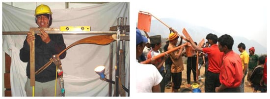 In the simplest version, the blades can be carved from wooden parts, fully or in parts. Mishnaevsky Jr., Sinha et al. [147,148] demonstrated the applicability of Nepali timber for low cost wind blades. The turbines with timber wind blades were installed on several locations around Nepal, and their usability was demonstrated (see Figure 10). Astle et al. [149] studied material and fatigue properties of Douglas fir and Sitka spruce and the manufacturing routes for small wind turbine blades, also using copying route. Pourrajabian et al. [150] tested different species of timber for use in small blades. Design and optimization of solid and hollow blades for a small horizontal axis turbine via genetic algorithms are presented. However, the technology of solid wooden blades can be used only for small wind turbines. Other approaches to wooden blades include wood construction (with a framework of ribs and stringers covered by planks) [151,152], wood epoxy blades (wet layup of impregnated wood veneers) (like that developed by Gougeon Brothers [153]), blade shells produced by vacuum infusion of wood with pultruded strips of carbon fibers (developed by NEG Micon).