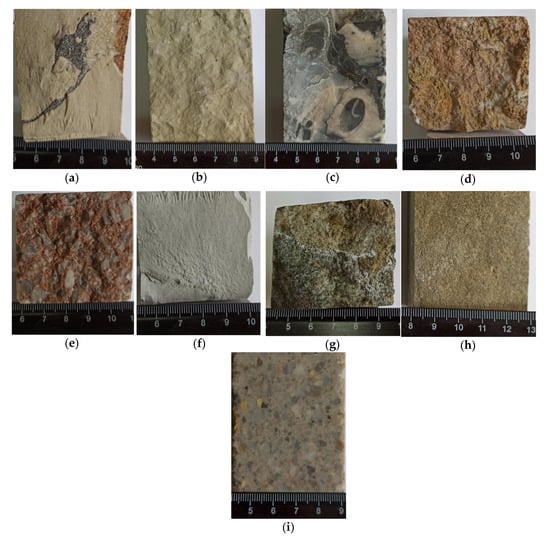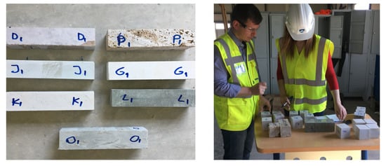 The raw samples were cut into regular prismatic or cubic shape in accordance with the respective EN standard such as EN 12372 [41] for the flexural strength and EN 1926 [42] for the compressive strength. The produced specimens were used also for the determination of the physical properties. Table 1 and Figure 9 show the coding and preparation of some representative samples for testing.