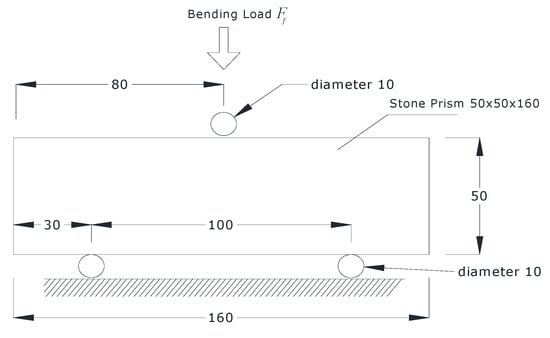The flexural strength test was performed in accordance with EN 12372 [41] using equation (1). According to this the thickness of the stone sample h should be between 25 mm and 100 mm, the total length l should be equal to six times the thickness, the width b should be between 50 mm and three times the thickness (50 mm ≤ b ≤ 3 h), and the distance between the supporting rollers l should be equal to five times the thickness.