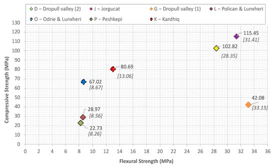 In Figure 11 are plotted the compressive strength and flexural strength of the tested specimens. According to the test results the flexural strength values vary from 8 to 33 MPa. The compressive strength test results showed that there is a large range in the values varying from 25 to 115 MPa. Physical properties test like open porosity and apparent density were performed according to EN 14617-1 [43], whereas the water absorption of the specimens was measured in compliance with EN 13755 standard [44].