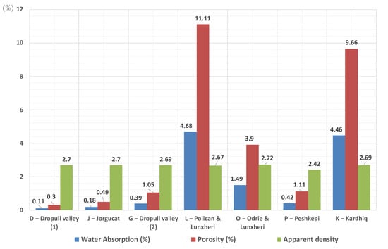 From a field investigation, seven traditional quarry areas were identified within the region of Gjirokastër and some representative specimens were collected for laboratory testing. The collected specimens were shortly identified according to the following letter designation: D—Red Limestone collected from Dropulli valley, J—White limestone collected from Jorgucat village, G—Gushëpëllumbi (pigeon neck) limestone found also in Dropulli valley, L—Black silicate stone found in Lunxhëri and Poliçan, O—Grey sandstone collected in Odrie village, P—Porous stone of Peshkëpi, and K—Riverstone of Kardhiq and Drino river (Figure 8).