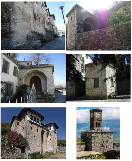 - Merxhani, K.; Mamani, E. Materialet ndertimore ne monumentet historike—Gjirokaster. Monumentet 2014, 52, 127. (In Albanian) [Google Scholar]
