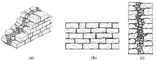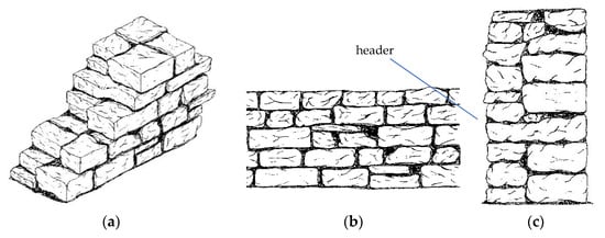 However, the design of reinforcement interventions depends on the structural behavior of the unreinforced, original masonry, including not only the mechanical characteristics of the constituent materials (stone and mortar), but also the masonry texture and arrangement (stone shape and dimensions, type of wall, wall thickness, etc.,). As a consequence, many studies have been published to assess the structural response of unreinforced stone masonry [29,30,31,32], highlighting the frequent unsatisfactory response against the seismic action.