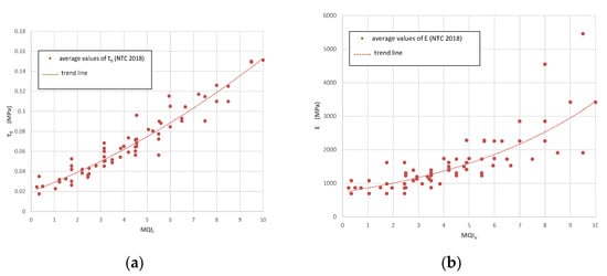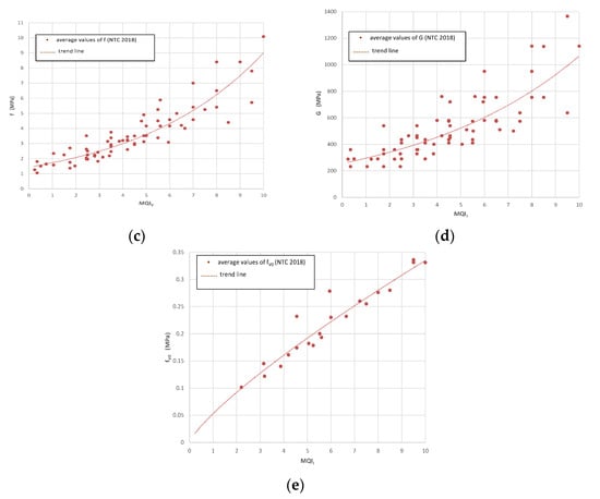 MQI correlations with masonry mechanical parameters: (a) Masonry shear strength τ0 vs. MQII (NTC 2018, Italian Seismic Code, [40]), (b) Masonry Young’s modulus E vs. MQIV, (c) Masonry compressive strength f vs. MQIV, (d) Masonry shear modulus G vs. MQII, (e) Masonry shear strength fV0 vs. MQII.