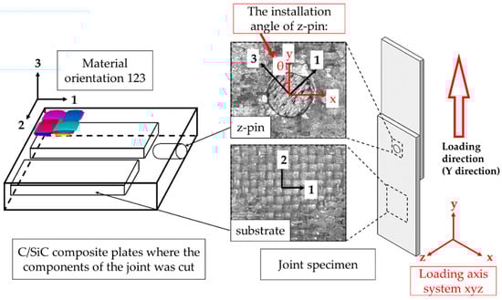 Figure 1, the material coordinate system is illustrated by “123” and marked in black. The global coordinate system is illustrated by “xyz” and marked in red. The assembly angle of each specimen was measured. Finally, the SiC matrix was deposited into the gap of the joints using chemical vapor infiltration (CVI) until the desired densification.