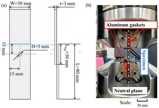 The tensile experiments of the C/SiC joints were carried out using the MTS (Materials Test Systems) Criterion C45 hydraulic testing machine (MTS Company, Eden Prairie, MN, USA) with a maximum load of 100 kN. To avoid deflection during the test, two aluminum gaskets were applied to ensure that the tensile loading axis passes through the neutral surface of the joint, as shown in