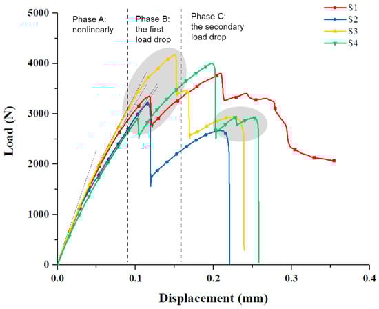 Figure 3, which could be divided into three stages. In phase A, the load increased nonlinearly with displacement. In phase B, the first peak load appeared, with the range of 2891–4172 N, and the corresponding displacement was 0.10–0.15 mm. In phase C, the second or more subsequent load peaks occurred. The load of the specimen S1 decreased gradually, while the specimens S2, S3, and S4 showed a sudden load drop and complete failure. The failure displacement was 0.21–0.25 mm and the corresponding load was 2670–2919 N. The average maximum load of the four test pieces was 3796.35 N. In this experiment, there were two or more load peaks. Similarly, the characteristics of two load peaks also were reported in the bolted/bonded hybrid joint of the epoxy composite [