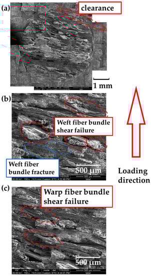 Figure 5. There is a clearance between the z-pin and the hole. Inside the z-pin, some weft fiber bundles were neatly fractured, indicating the characteristics of tensile failure. The fracture surfaces of some weft fiber bundles were at a certain angle to the fiber longitudinal axis, which could be attributed to shear failure. Besides that, the warp fiber bundles mainly exhibited shear failure. To view the z-pin as a whole, the fracture was not in one surface, which could be explained by the stress concentration caused by the woven structure of z-pin.