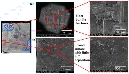 Figure 4. The secondary SiC deposition was concentrated in the diagonal position or around the overlap area. Both the z-pin and the secondary SiC deposition area were further investigated through SEM technology.