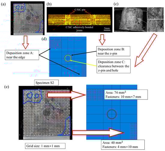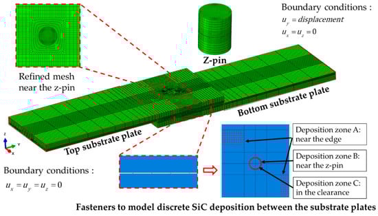 Figure 7, the area on the substrate plate near the edge (deposition zone A, DZA), the area on the substrate plate near the z-pin (deposition zone B, DZB), and the area in the clearance between the z-pin and hole (deposition zone C, DZC). The deposition zone A can be seen from the SEM pictures that the SiC deposition is discretely distributed like welding spots. It is not appropriate to be modeled with the continuous cohesive layer. Enlighted by the numerical modelings of spot welding [