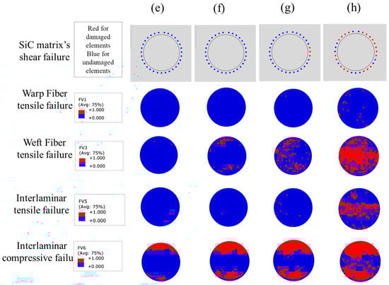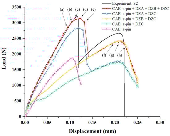 Load–displacement curves of the numerical results with different SiC deposition zones. (Point (a)–(h) represent the key moments of the failure process, and are explained in