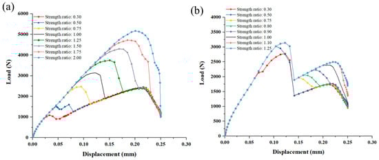 Load and displacement curves of different strength of: (a) Deposited SiC matrix in DZA; (b) Deposited SiC matrix in DZB.