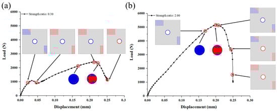 Progressive failure of the joint when the strength of SiC matrix in deposition zone A (DZA) is (a) 0.3 times; (b) 2.00 times the original value.