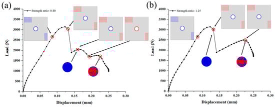 Progressive failure of the joint when the strength of SiC matrix in deposition zone B (DZB) is (a) 0.8 times; (b) 1.25 times the original value.