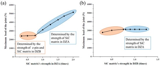 The relationship of the joint’s maximum load and the deposited SiC matrix’s strength in (a) DZA; (b) DZB.