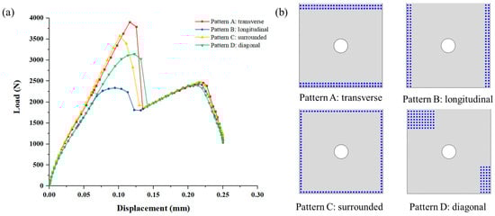 (a) Load and displacement curves with different distributions of the deposited SiC matrix in DZA; (b) Four distribution patterns of the deposited SiC matrix in DZA.