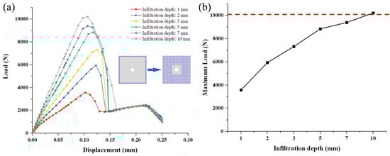 (a) Load and displacement curves with different infiltration depths of the deposited SiC matrix in DZA; (b) Relationship between the joint’s maximum load and the infiltration depth of the deposited SiC matrix in DZA.