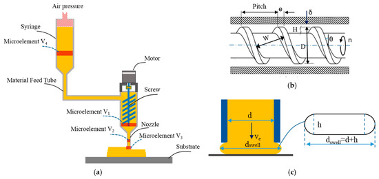 Otherwise, if given h≪d, theoretically, from Equation (7), ≪ should be satisfied. However, in order to provide enough power to extrude the feedstocks, has a minimum limit, here denoted by . Meanwhile, vxy has a maximum limit value, here denoted by . Therefore, ≪ should not be established. As illustrated in Figure 2c, this leads to irregular and uncontrollable extrudate shapes and the size error becomes very large. In other words, theoretically, the layer height has a minimum limit, which can be defined as follows: