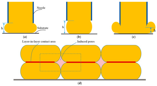 Here, we consider Equation (7) as the flowrate equilibrium equation of the extrusion process. This derived equilibrium equation theoretically revealed the restrictive relations of the basic parameters h, and . It provides clearer insights than the purely experimental methods [16,19]. Geometrically, these three process parameters, h, and , directly affect the extrudate shapes and layer-in-layer adhesion, as shown in Figure 2.