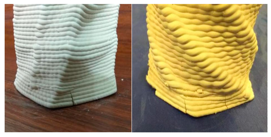 Along with the decrease in the moisture content, the solid content, dimensions, shape, and rheology of the depositing filament change simultaneously. In early drying, the depositing slurry is fluid enough that any constrained stress is immediately relieved by viscous flow [42]. As drying proceeds, the differential shrinkage between the top and bottom of the layer due to the moisture gradient across the thickness of the drying layer occurs. Another driving force is the capillary tension in the pore liquid, which varies in the thickness direction if the evaporation rate is fast relative to the transport rate of the liquid [43]. This pressure gradient may cause warping or cracking if the part body is not stiff or strong enough. Additionally, the complex shapes and structures of depositing parts including protrusions, edges and corners, and wall thickness also affect the moisture gradient redistribution. When the stresses caused by nonuniform shrinkages exceed the fracture resistance of the extrudate, visible or hidden cracks occur.