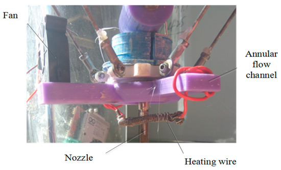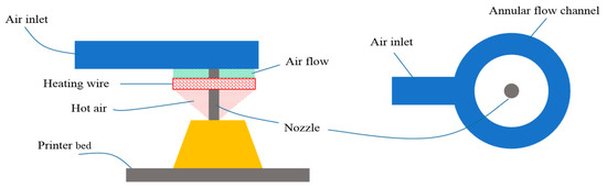 As presented in Figure 7, the in situ hot air flow drying device mainly consists of three parts: fan, annular flow channel, and heating wire. The fan provides flowing air, and the heating wire heats the air flow. The heated airflow is blown towards the material deposition spot. Since this device is attached with a nozzle, the extrudate can reduce water content as quickly as possible. This first diminishes the moisture gradient distribution to avoid nonuniform shrinkage. Furthermore, according to Equations (17) and (18), this will decrease the surface tension of water , thereby heightening the critical cracking thickness . Collectively the online hot air drying will expectedly eliminate the cracks.
