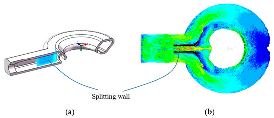 The key to the whole device is to enable the air to blow out uniformly from the annular flow channel to achieve the purpose of uniformly heating the ceramic paste. Therefore, in the structural design of annular flow channel, we used the finite element simulation method of fluid mechanics to optimize and verify the structure. As shown in Figure 8, after design a splitting wall in the inlet, air flow blows out more uniformly along the annular flow channel.