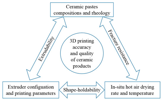 From Equation (1) to Equation (22), we systematically introduce the mathematical representations for the extrusion-based 3D-printing process of ceramic pastes. These mathematical equations can scientifically describe the extrusion dynamics, slurry rheology, drying kinetics, and cracking behavior. In practical engineering, as illustrated in Figure 10, they should be exactly coupled by controllable enabling technologies to ensure high dimensional accuracy and good surface quality.