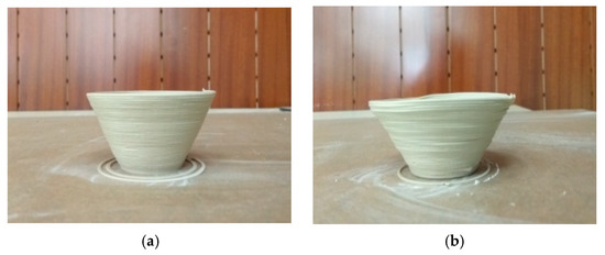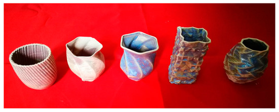 According to our experimental observation, no cracks occurred in all of the 3D-printed ceramic samples. The measurements and statistics showed that there was no dimensional shrinkage of the fully dried 3D-printed ceramic samples after biscuit firing at the temperature 800 °C. Moreover, we also tried to glaze the 3D-printed ceramic vessels as given in the Figure 15. Furthermore, the dimensional shrinkage of the 3D-printed biscuit bodies is about 20% after high-temperature glazed sintering at the temperature 1250 °C [39]. These ceramic products with profiled surfaces were almost impossible to fabricate via traditional craftsmanship. This demonstrates that fully digital and easily available extrusion-based 3D printing of ceramics has great potentials.