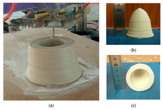 Comprehensively speaking, ceramic paste is a non-Newtonian fluid with a large water content [10,16,22]. During layer-by-layer forming, the ceramic paste cannot be solidified immediately. Especially under the combined effects of layered gravity increments and liquid phase migration, the layer-in-layer adhesion and the strength of the previous layer cannot support the currently deposited layer, which would inevitably lead to the accumulation of errors until collapses or deformations happen.